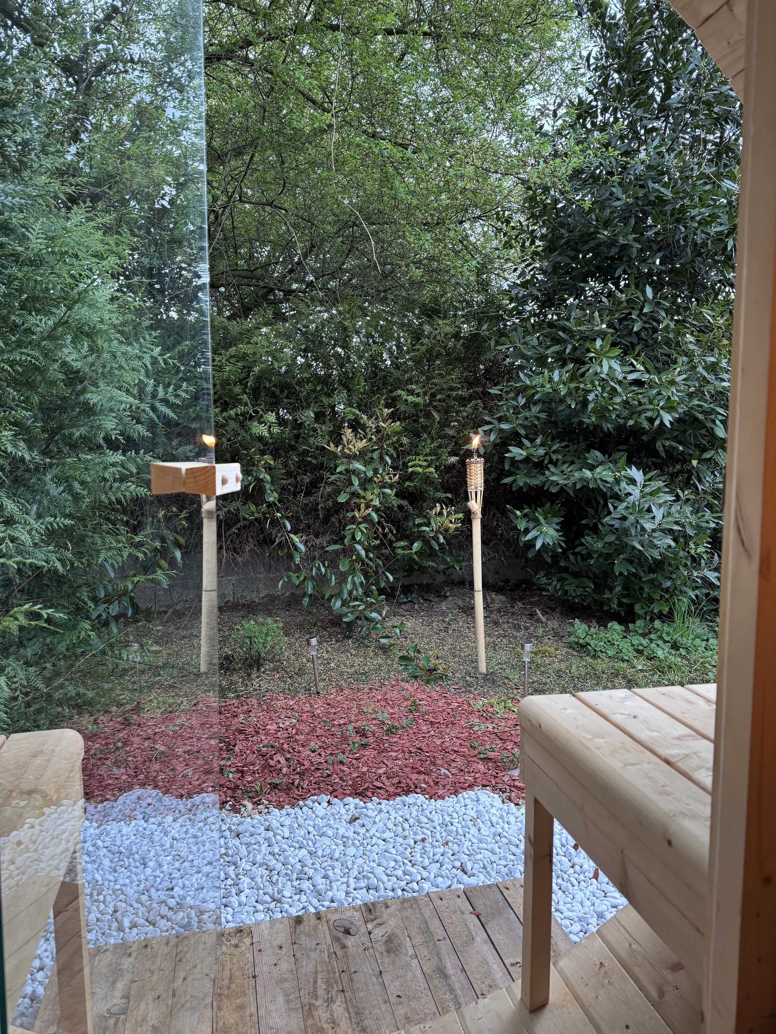 Blotti sous un laurier, au fond du potager de Chez Anne, les hôtes peuvent profiter d’un sauna en tonneau de bois et d’un bain chaud au bois, à l’abri des regards.